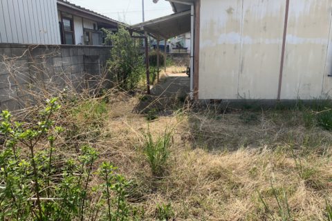 雑草や枝が伸び放題の庭。